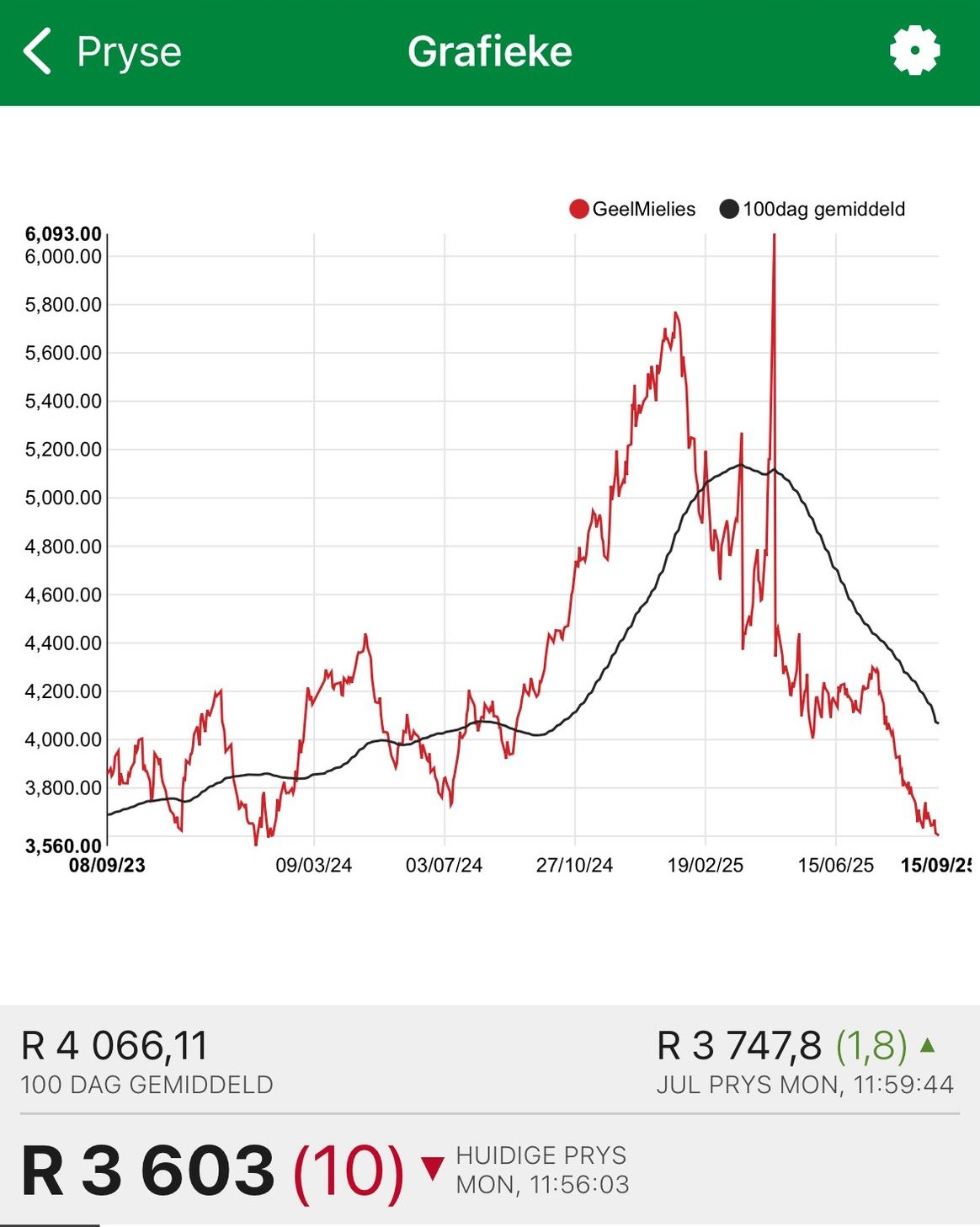 I was looking at yellow maize prices for today, and they remain at a level around R3,600 per tonne, which is roughly 7% down from a year ago. Soybeans, another key input in feed, are priced around R7,300 per tonne, which is down approximately 13% from a year ago.