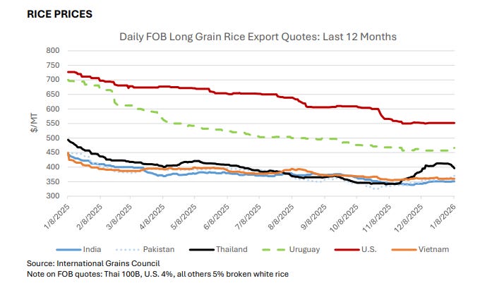 It is perhaps too early to be writing about rice. But I come bringing good news. Global rice prices are under pressure due to ample supplies, see the chart below.