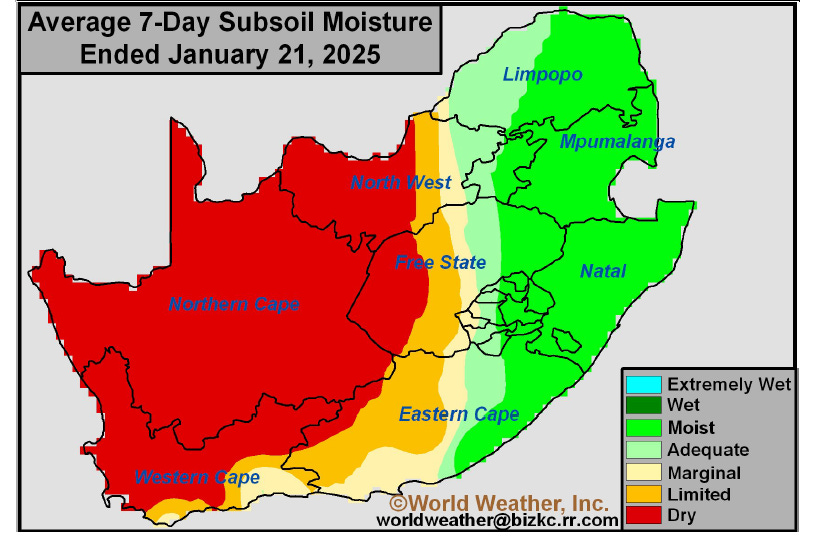 Fortunately, this week's weather forecast promises widespread showers across South Africa's summer crop-growing regions—see here. If these rains materialize, we will continue with this favourable agricultural path for the season.